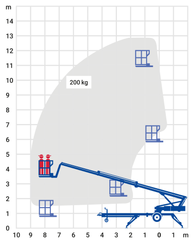 Die Anhänger-Arbeitsbühne mit einer Arbeitshöhe von 12,00 m ist die mobile Alternative zu einem fest installierten Gerüst. Für den Transport zum Einsatzort ist lediglich ein Fahrzeug mit Kugelkopfkupplung erforderlich. Die Traglast liegt bei 200 kg und die lastenabhängige seitliche Reichweite bei 8,50 m. Die Anhänger-Arbeitsbühne ist für den Einsatz in Innen- und Außenbereichen geeignet und ermöglicht ein flexibles Arbeiten in mittlerer Höhe.