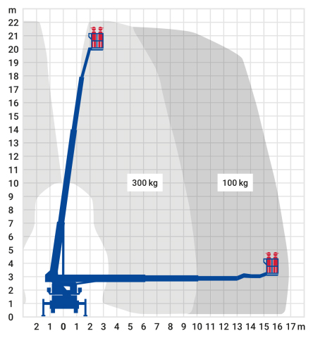 Mit einer Arbeitshöhe von bis zu 22 m ist die LKW-Arbeitsbühne ein Multitalent, das den Anforderungen in wechselnden Arbeitsbereichen gerecht wird. Ob beim Baumverschnitt in der Stadt, bei Ausbesserungsarbeiten an Fassaden, bei der Inspektion von Brücken oder beim Hallenbau, der LKW-Steiger zeichnet sich durch große Flexibilität und hohe Stabilität beim Arbeiten in großer Höhe aus. Die maximale seitliche Reichweite liegt bei 14 m und das zugehörige Fahrzeug kann mit einem Führerschein der Klasse B gefahren werden. Durch seine flexiblen Stützen kann die Maschine sich perfekt an die Baustellengegebenheiten anpassen.