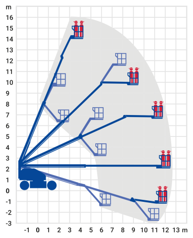 Die Allrad Teleskoparbeitsbühne mit einer Arbeitshöhe von 16,00 m zeichnet sich durch eine hervorragende Manövrierfähigkeit, auch auf unbefestigtem Untergrund, aus. Die erstklassige Steigfähigkeit macht Arbeiten auch in schwierigem Gelände möglich. Die Traglast liegt bei 220 kg. Die lastenabhängige, maximale seitliche Reichweite der Teleskoparbeitsbühne liegt bei 12,30 m. Die Hubbühne ist vielseitig einsetzbar auf Baustellen, bei Reparaturarbeiten in großer Höhe, beim Aufbau von Messe- und Veranstaltungshallen oder bei der Brückeninspektion.